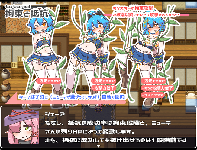 一方で、あくまで万全の状態であればの話。拘束解除を試みる度に、体力(HP)も減少していきます。連戦や長期戦になれば解除できる確率も下がっていきます。抵抗できる体力もなく、エッチな攻撃を受けてMPも吸収されてしまえば、逆転も大変です!アイテムで回復なども意識したり、後半には抵抗力を上げるような魔法も出てくるので、うまく補助魔法も検討する必要が出てきます。