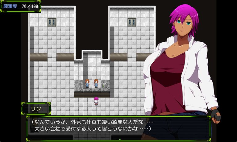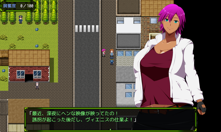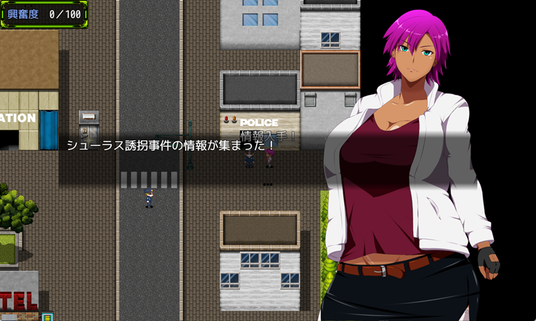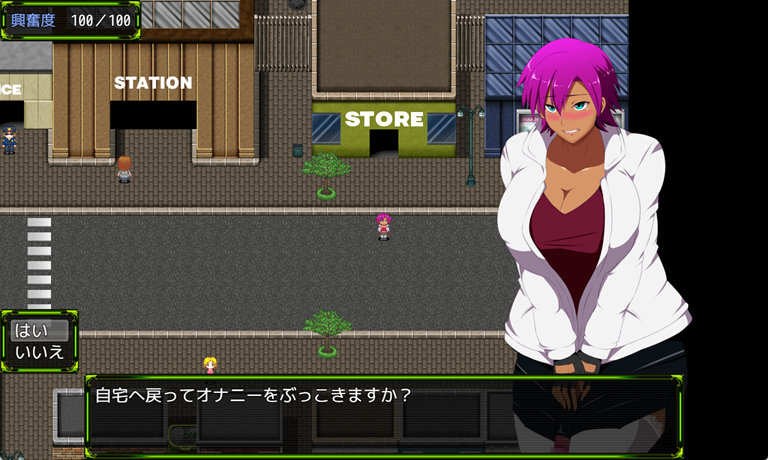 興奮してフタナリ勃起するような点は、バトルだけではありません。プレイヤーは街中の探索時にもエッチな行為を見たり、魅力的な女性に話しかけたり、オカズになりそうなポスターなどを調べてしまうことで、興奮度が上昇。興奮度が100になってしまうと、街中で勃起してしまい、勃起を隠すように移動をすることになります。