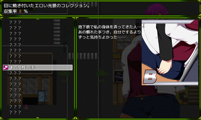 また、メニューには「オカズリスト」という収集要素もあります。興奮度が上がるようなエッチな出来事のポイントなど、探索で見つけられるオカズリストがどんどん追加されていきます。なかなか種類も多いので、収集的なやりこみもあるかもしれません。