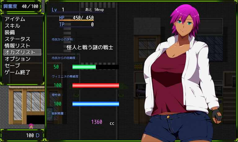 三回射精してしまうと、戦闘敗北にもなってしまいます。勃起したらすぐにTP技で発散していきましょう。なお、ボス戦に敗北すると犯されてしまうようなエッチが発動。メニュー画面から確認できる「市民からの信頼度」が下がってしまいます。