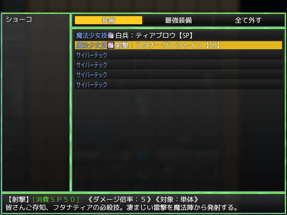 「DANGER」は敵側のゲージで行動を行うことで上昇していき、上がるほど大ダメージを受けることになります。半分ぐらいまで上昇すると難易度ノーマルでも大ダメージを受けることもあるので、長期戦の戦略を取る場合は意識する必要があります。「SP」は逆に味方が被ダメージや攻撃行動をする、移動コマンドをする時に上昇します。SPは上限100となっており、装備している魔法少女技を使う事が可能です。魔法少女技はSPのみ消費し、行動値のみ消費。威力も比較的高い技が多いので、大ダメージが狙えます。こちらもスキル入手することで、装備欄からカスタマイズすることが可能です。