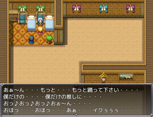男性キャラたちは立ち絵もなく、モブキャラに近い感じですが、ゲーム開始直後のシーンでは名前付きモブとして会話が可能ですし、道中では彼らがピンチになってしまうようなこともあります。途中には彼らが堕落する過程で問題が発覚したり、なんとか救助しようと物語が展開していくこともあります。